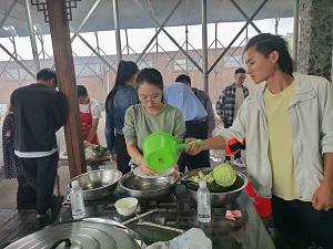 農家柴火土灶對90后們更是一場考驗,隨機分成3組,各小組成員分工合作,生火、洗菜、切菜、掌勺.....隊友們一起商討配菜、生火技巧、切菜形狀,實在動不了手的隊友就剝蒜、搬柴、洗碗。